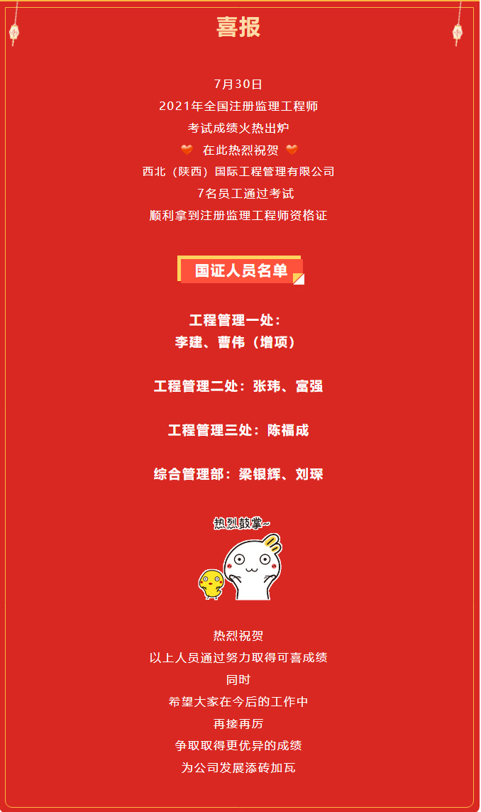 喜訊!西北(陜西)國際工程管理有限公司7人通過監(jiān)理國證考試