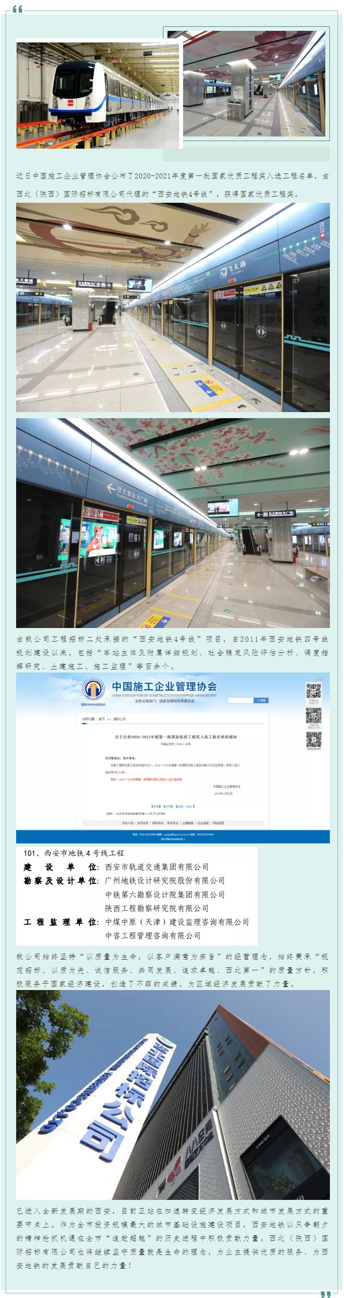 由西北國際招標(biāo)公司代理的“西安地鐵4號線工程”榮獲國家優(yōu)質(zhì)工程獎