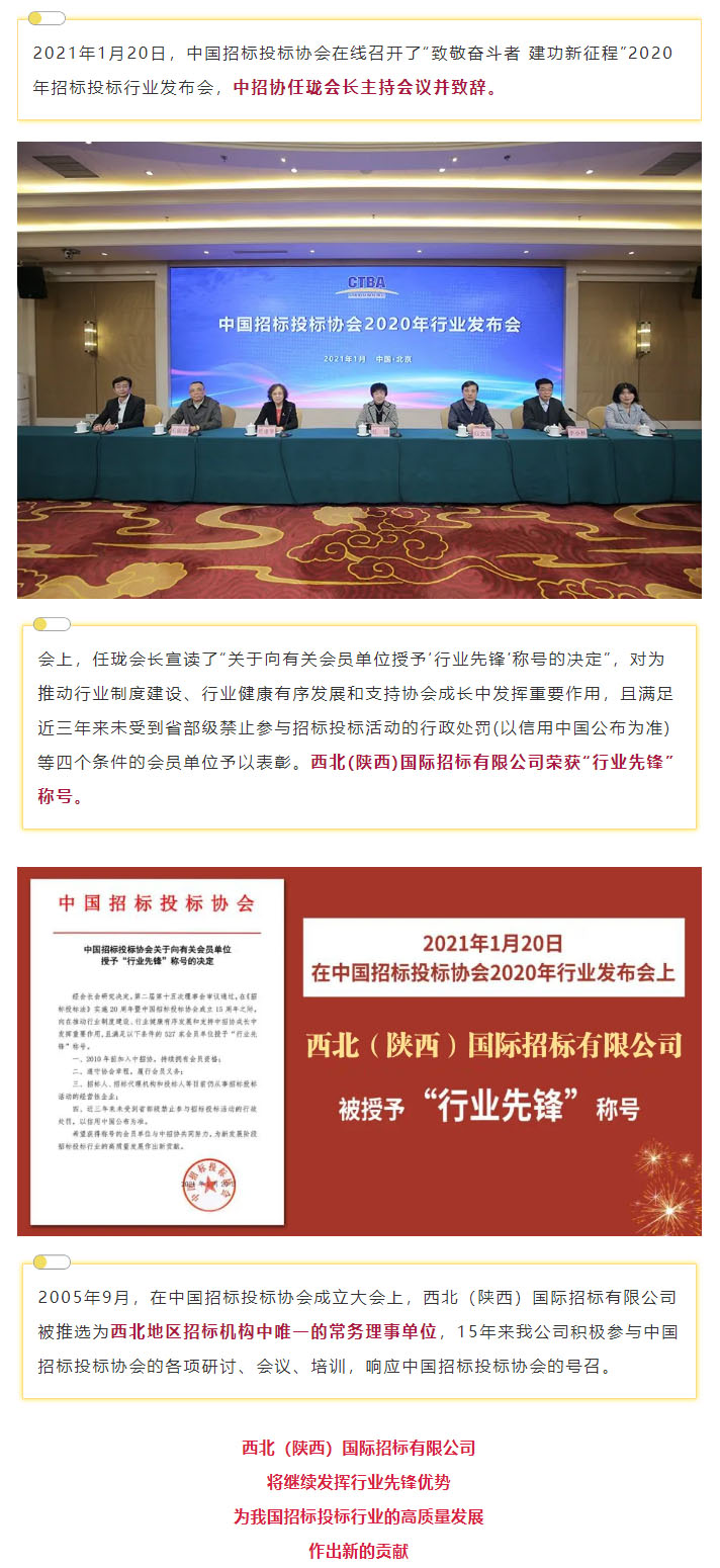 西北(陜西)國際招標有限公司被中招協(xié)授予“行業(yè)先鋒”稱號