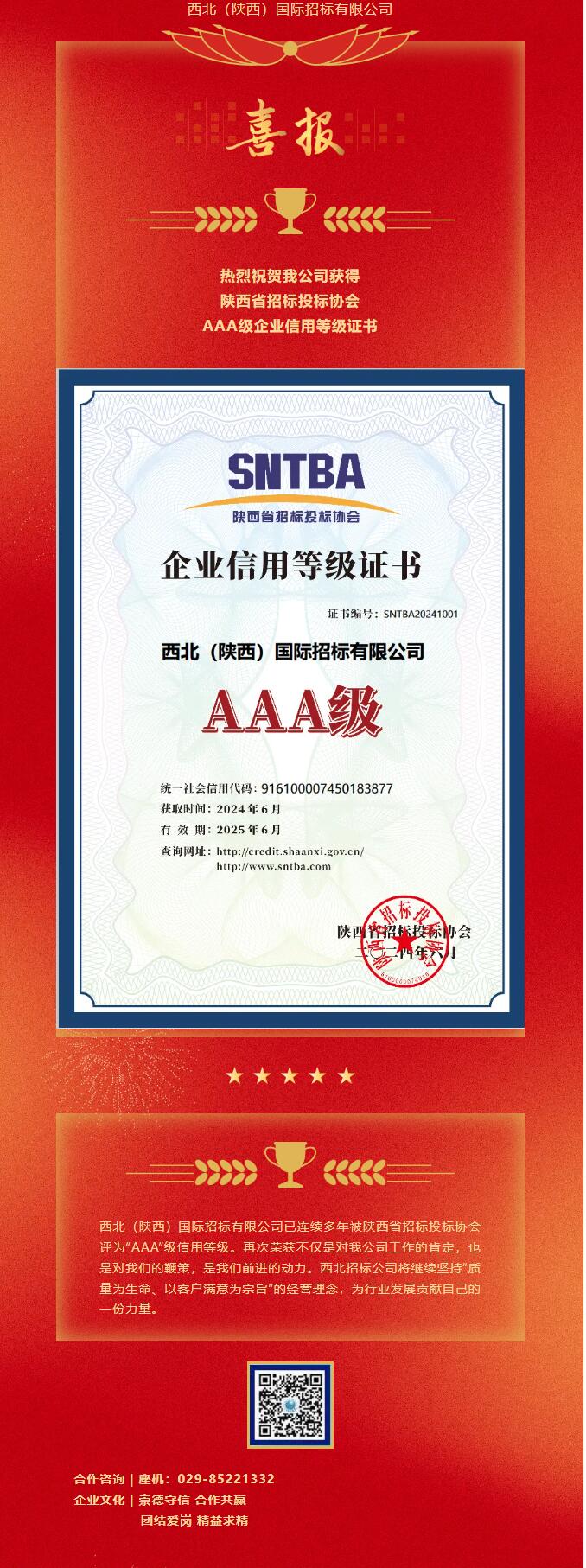 熱烈祝賀我公司獲得陜西省招標投標協會AAA級企業信用等級證書