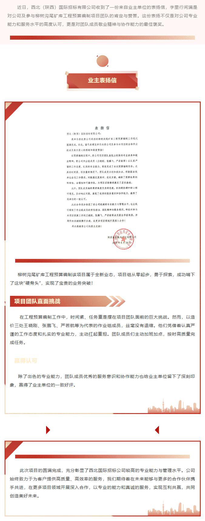 專業鑄就口碑,協作共贏未來--西北(陜西)國際招標有限公司獲建設單位高度贊譽